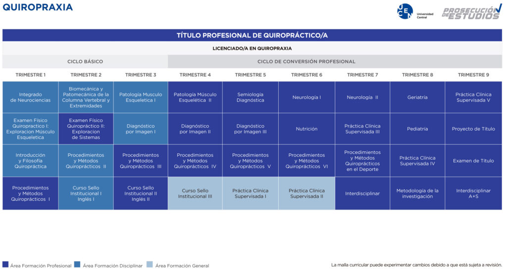La Universidad Central de Chile es la única universidad chilena que dicta este segundotítulo y Licenciatura en el país. Como tal está reconocida por la Federación Mundial Quiropráctica WFC y es miembro ICEC, es decir pertenece a la red internacional de universidades con énfasis en la formación con base en la evidencia de sus estudiantes de Quiropraxia.